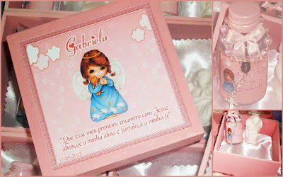 A Manuella recebeu de lembrancinha essas lindas caixinhas 10x10 com papiro, sabonete de anjinho, garrafinha de água benta e almofadinha com tercinho.